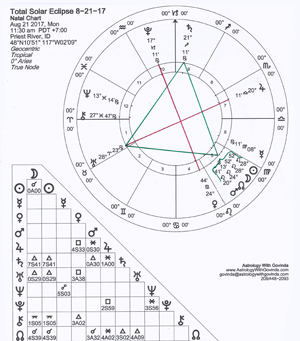 In the Great American Eclipse, there is a Grand Trine in the Fire Element configuration (see the Green Triangle) that includes the North Node, Sun, Moon and Mars in a Stellium (a large Conjunction of celestial energies, all in Leo), Saturn (in Sagittarius) and Uranus (in Aries). The energies of this Grand Trine supports us to create expansion, abundance and success in whatever we initiate that serves the highest good of all.